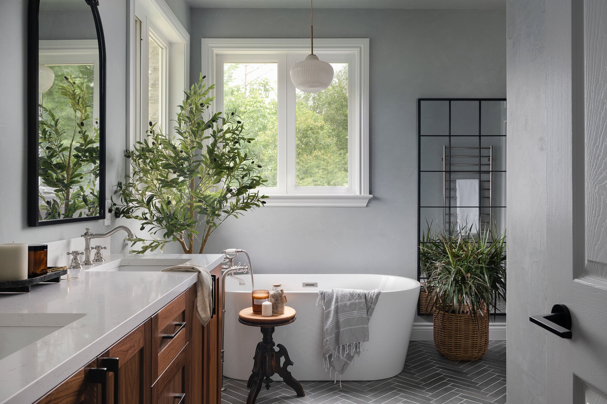 Starting with the slate grey flooring, laid in a herringbone pattern throughout the room and extending into the shower, the room has an organic, old-world feel. Our team hand applied Roman Clay to the walls and ceilings, enveloping the space with luxurious textured surfaces and connecting it to the outdoors. A double vanity made of solid wood, with vintage-inspired faucets and mirrors, adds warmth and character to the room. A simple and elegant bathtub was selected for the space. Its design blends well with the overall look of the room and showcases the beauty of the other textures and materials used.
