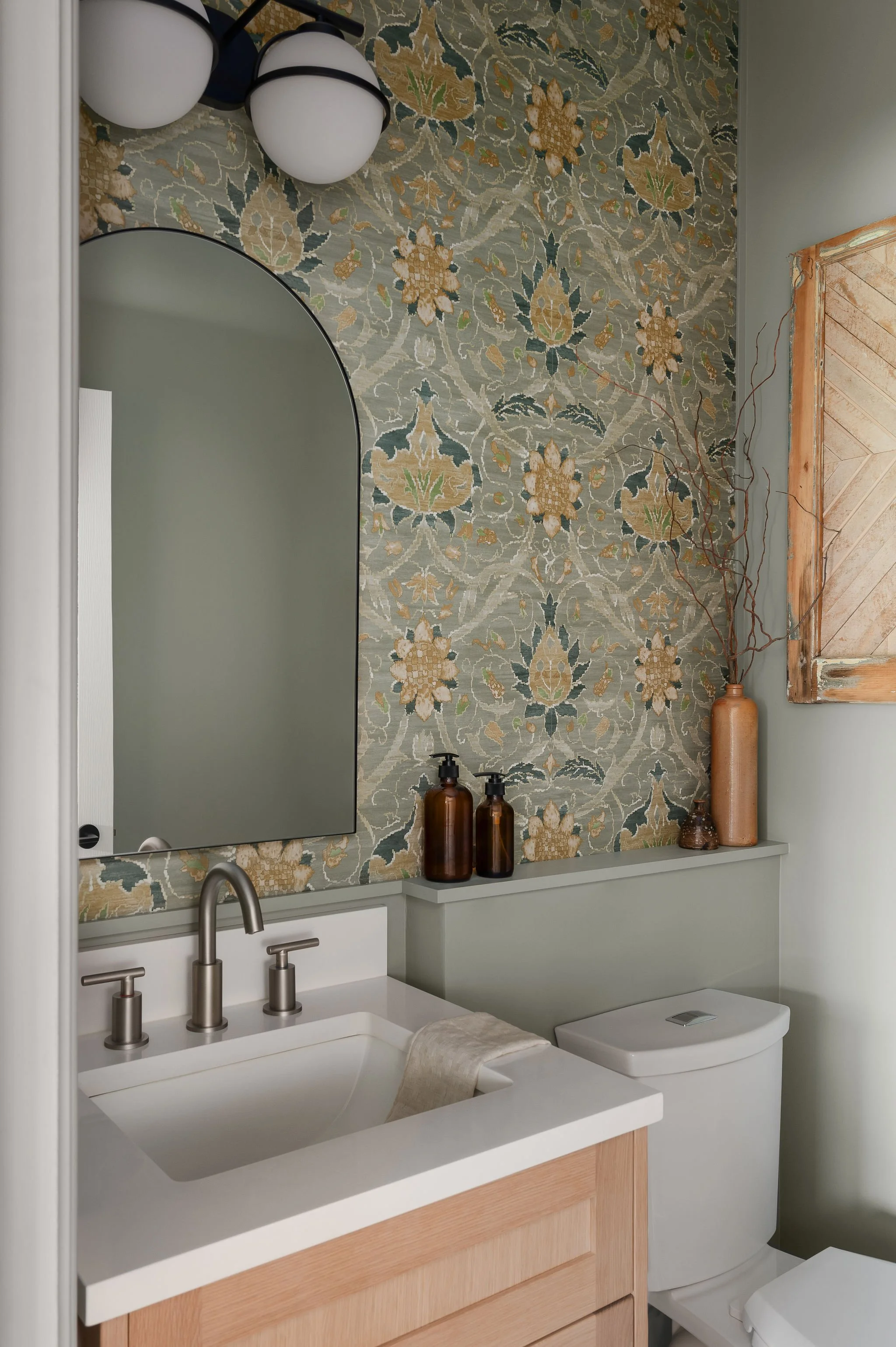 Our clients freely admitted that the powder room, was kind of a forgotten room and used only occasionally. The finishes were original to the home. We wanted to design a space that not only their dinner guests would love, but that they would too. Powder rooms offer an opportunity to be more dramatic. Using the same flooring as in the mudroom, bold, vintage-inspired wall paper behind the vanity, and beautiful moss green paint on the walls and ceiling the space was transformed into a unique, character filled space.