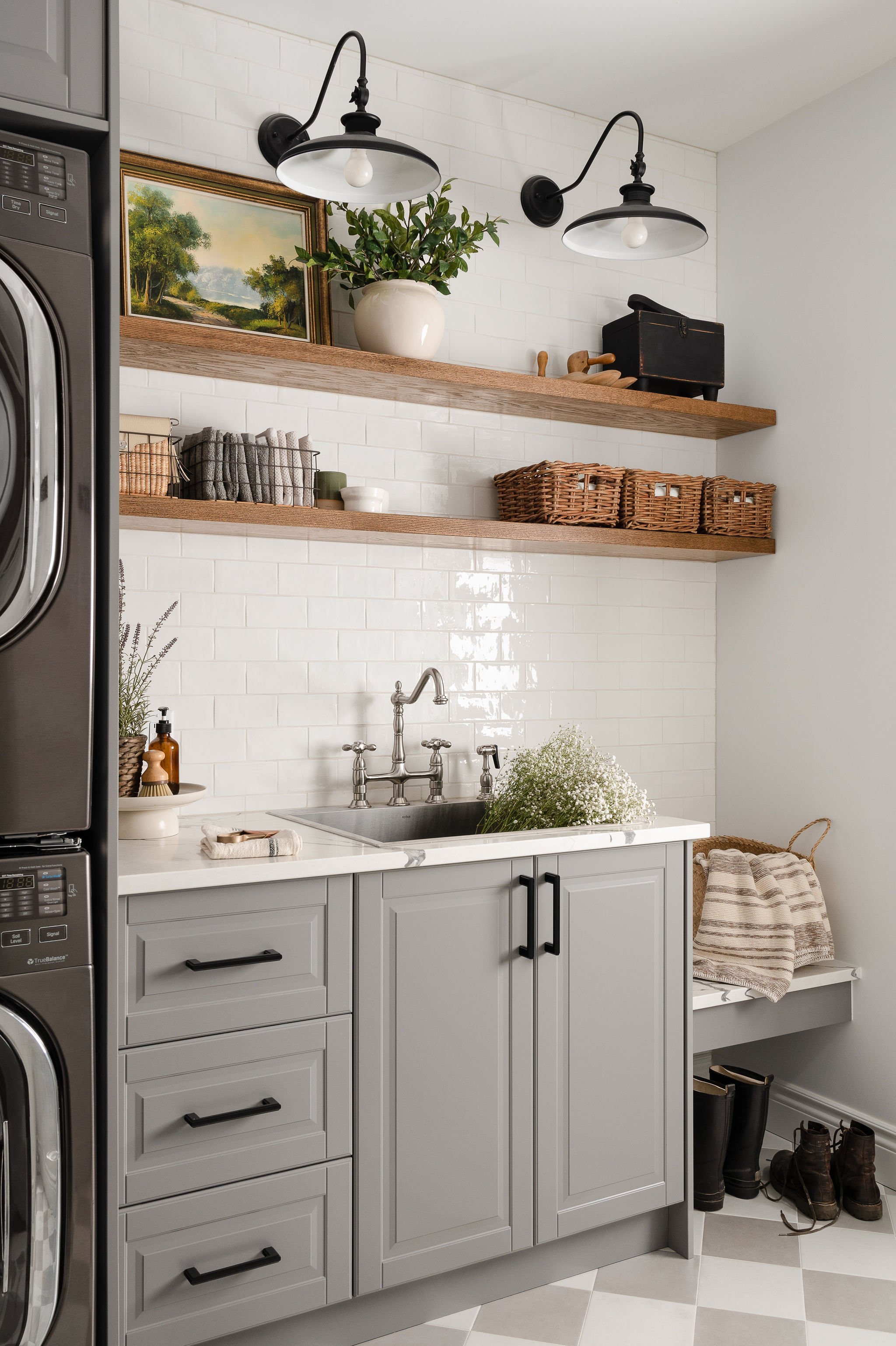 The mudroom was an essential component to the renovation. For their home to have the function our clients needed, the room had to act as the drop zone from a day of gardening, a place to wash the family dogs and, of course, a laundry room. It also needed a bench so it would be easy to pull shoes and boots on and off. By removing the closet storage in this space and stacking the washer dryer, we were able to add in a sink, drawers, and bench. The bench was topped with the same quartz as the cabinetry to extend the durable working space.
